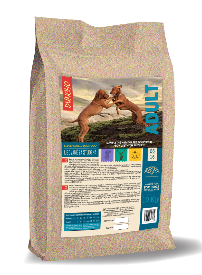 DUNCHO ADULT superpremium food lisované za studena. Kombinácia 3 druhov mäsa –morčacie, jelenie a hovädzie s tekvicou a rýžou. Low grain. Veľkosť granul – v priemere 8mm peletky, dĺžka 2-3 cm. Krmivo je balené v ekologických papierových obaloch.
